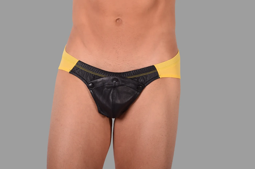SMU SEXYMENUNDERWEARUnique Peekaboo Collection These Peekaboo briefs is available in XS Made of a luscious knit fabric and full front Leather pelvis and removable pou...