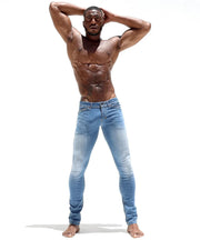 The new generation of the iconic "Hendrix" slim-fit straight-leg denim jeans made from premium stretch denim distressed with a California “sun kissed” wash.